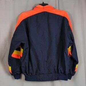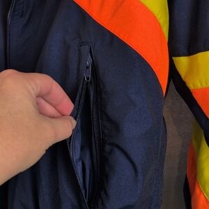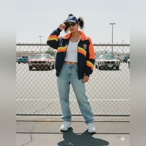 Elevate your style with this vibrant orange and navy bomber jacket. Perfect for a bold, contemporary look.