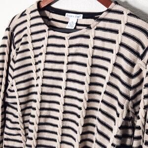 This Eagle’s Eye cable knit sweater delivers nautical preppy classic style with sailor stripe detail and a relaxed prep cut. Crafted in soft 100% cotton, this size XL sweater embodies coastal chic and yacht club vibe, the kind of maritime piece that feels right at home on the deck or by the shoreline. The neutral stripe pattern makes it endlessly versatile, giving it a casual edge that moves easily.