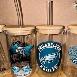 Set of 4 unique Philadelphia Eagles glasses all with bamboo lids and glass straws. Handwash only.