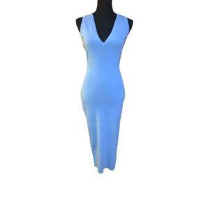 Sky blue v-neck Bodycon dress. Sleeveless. Hits below knees. 65% rayon/35% nylon. Size: small. NWT.