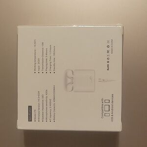 Brand new earbuds still in the plastic wrap, never opened. Says it works with ios and Android devices.