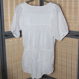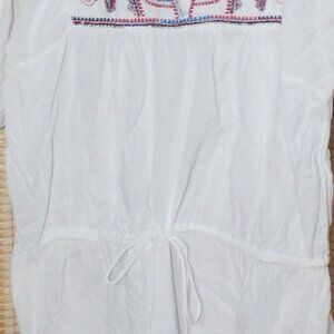 Earthbound Trading Co. woven peasant blouse with red and blue embroidery and beaded accents. Short sleeve and belted tie.