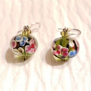Blown Clear Glass, Blue, Pink, White, Green Flower Earings. Silver Tone Metal