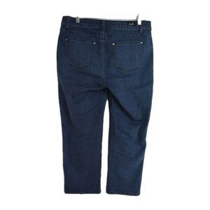 The product is a pair of Earl Jean Capri Jeans in women's size 10, featuring a dark blue color with white polka dots. Made of a cotton blend denim fabric, these straight leg jeans have a mid-rise fit with a 5-pocket design and a 23-inch inseam. They are machine washable and equipped with a zip and button closure. The jeans also come with the brand's logo accents, making them a stylish and comfortable choice for women looking for a fashionable pair of bottoms.