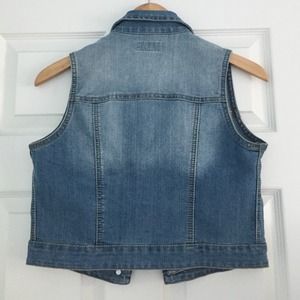 Earl Jeans XS juniors denim vest Jean jacket. Never worn, without tags. Features a neat, pleat-front detail and top-stitched seams, front and back. Cotton/polyester/spandex. Buttons up the front. Sleeveless. Two front pockets; two chest pockets with single button flaps. Slight fade wash/light wash.