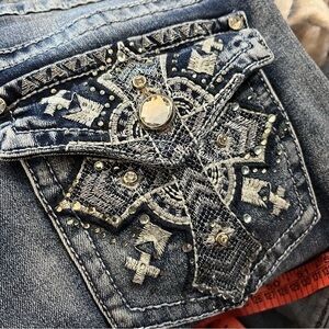 Features: Slim. Bootcut. Rhinestone Embellished Pockets. Factory Fading. 5-Pocket Style. Belt Loops. Zip/Button Closure. Stretch Denim. Y2K Vibes.