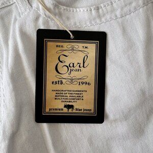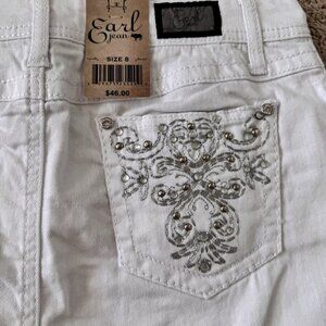 This is a new Earl Jean white denim mini skirt in size 8 with embroidered pockets featuring gem embellishments. The skirt has a solid pattern with silver stitching, a zip closure, and a mid-rise. Made of a cotton blend fabric, it has a preppy, 90s festival theme. The skirt is machine washable and has a vintage style, suitable for all seasons.