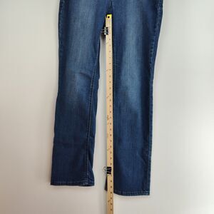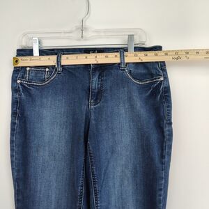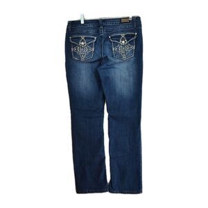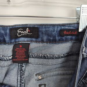 The Earl Jean women's jeans in size 8 feature a bootcut style with a mid-rise waist. Made from denim fabric with a medium wash, these jeans are accented with rhinestones and embroidered details. The 30-inch inseam and blue color make them a versatile and stylish option for any woman's wardrobe.