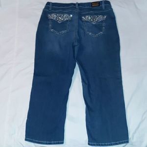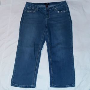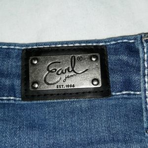 Super cute cropped jeans by Earl Jean. Embroidered embellishments around the front pockets and on the flaps and edges of the back pockets. Nice and soft denim.