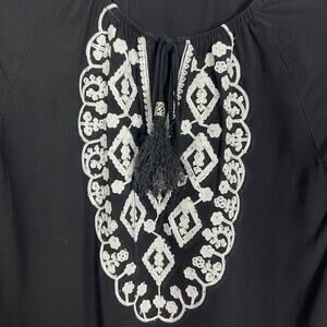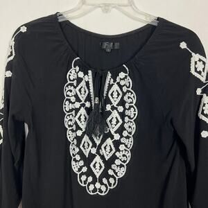 Women's black pullover top. Scoop neck with tassels. 3/4 sleeves with elastic hem. Embroidered accents with rhinestones. In good used condition. No stains, tears or holes.
