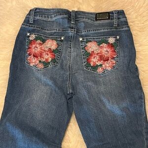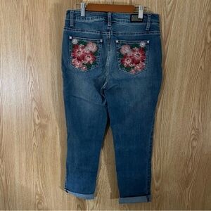 These jeans are beautiful with detailed floral back pocket embroidery, stretch for comfort and cuffed, cropped, straight leg style.