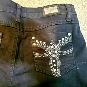 Revive retro fashion in style with these Earl Jean Black Denim Pants in Size 6. 🖤Embrace retro glamour with metallic embellishments on both front and back pockets.