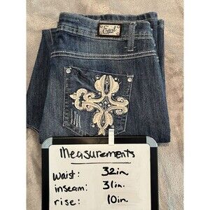 Earl Jeans Women 10 Blue Straight Leg Embellishment Bling Western Cowboy. Add some sparkle to your denim with these Earl Jeans for women. The blue straight leg jeans feature rhinestone and embroidered accents, a zip and button closure, and pockets for comfort. The cotton denim material is light in wash and has a regular fit, making it perfect for a day out in the Wild West or a casual evening wear. The jeans are available in size 10, with a waist size of 32 inches and an inseam of 31 inches. The mid-rise jeans are designed for women who love cowboy themes, and the stretch feature adds an extra layer of comfort. Get ready to ride the range in style with these Earl Jeans!