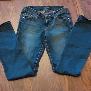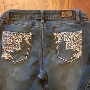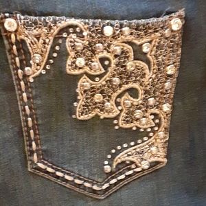 Earl jeans rhinestone embellished stretch bootcut jeans. Classic 5 pocket style. Size 9. Approximate measurements 15" across waist laying flat. 8" rise. 33" inseam. 73% cotton 17% polyester 18% rayon 2% spandex. Machine washable. Excellent pre owned condition. Smoke free and pet free home