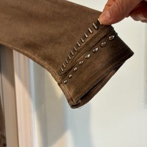 aged dyed style fabric ,Dark tan, studded-silver, suede look fabric. Very good condition.VERY SOFT