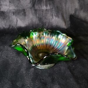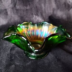 This exquisite tri-corner bowl is a remarkable piece of early 20th century American glassware, made by the renowned Fenton company. The bowl features a stunning stippled rays pattern, with vibrant multi-colors that are sure to catch the eye of any collector. It is handmade and crafted from high-quality glass, making it a unique and valuable addition to any antique collection. Family piece. No chips or cracks