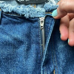 Brand is Express from the early 2000’s. 100% cotton. made in Mexico. Medium faded wash. Has a raw hem detail on the waist & bottom of leg. ~ in great condition, no flaws.