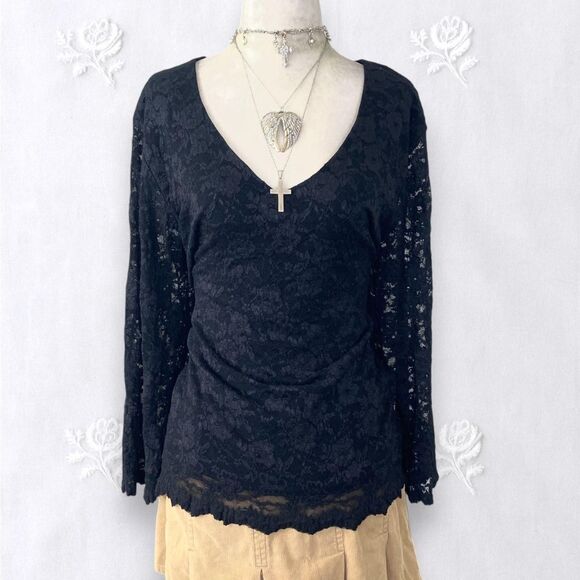 Early 2000's Black Goth Whimsygoth Lace Sheer 3/4 Sleeve Blouse Top 1X Plus Size