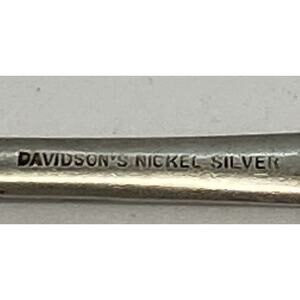 The first Spoon was made by “Davidson’s” and is marked “Nickel Silver” on the back of the handle. It is in good condition with some stains and minor pitting in the bowl and handle. It measures 7” Length x 1 1/2” Width.