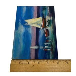 The scene shows two sailboats on the water as the sun is setting. Four people are watching the sunset from shore. Two smaller boats are moored closer to shore. The painting has lovely blues, pinks, yellows, reds, greens, blacks, and whites in it. The Artist signed the painting in the bottom right hand corner. The painting is in Very Good condition. On the back, you can see where the Artist had the painting attached to his display board.