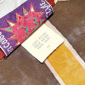 Fabric is made of 100% rayon and the tag says it's sized at medium, but it measures at a very roomy MED to LRG. Maybe that ties into the "cutting loose" dynamic.