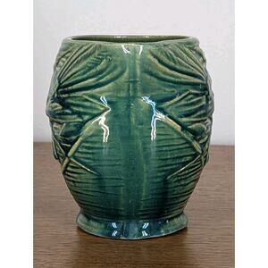 The Early McCoy Bird and Cherries Art Pottery Pitcher with a green glaze is a charming piece of kitchenware that was made in the USA during the early 20th century. The pitcher features a nature-inspired print of birds and cherries, showcasing a farmhouse style with a glossy finish. Standing at 5.5 inches in length and 5.25 inches in height, this ceramic pitcher adds a touch of rustic elegance to any kitchen or dining space. Ideal for serving beverages or as a decorative accent, this McCoy pitcher is a unique addition to any collection.