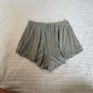 Our Early Riser Cotton Blend Shorts are a heather grey with a raw hemline and an elastic waistband.