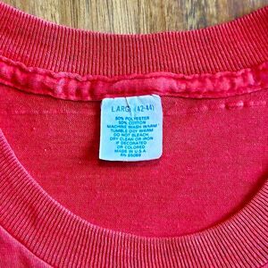50% cotton/ 50% polyester. This shirt stayed in a set of dressers of a family friend for probably 30 years without wear and then I found it, throwing in about 10 wears over a couple years and then forgot about it. It's a classic 70s blended cotton tee, that will break in great and likely outlive us all. It's labeled a size L, but wears more a modern fitted M.