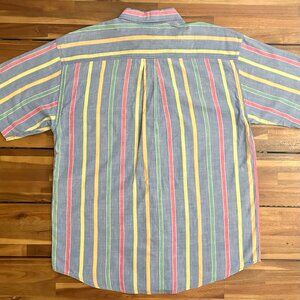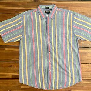 Prime example of the perfect summer shirt. The color bomb scheme is awesome and it's been made with a lighter weight 100% cotton fabric, that wears very comfortably and breathes well in the heat. I bought this large thinking that it's vintage sizing may lay more like a medium, as often shirts over 30 years old do, but this is a true modern day large cut. Fabric is in good shape, with no pilling and has the feel of a lesser worn fabric. However there is one small fabric pull on the left side near armpit. It is minor, but still exists and referenced in photos. I suppose you have to almost be looking for it, so I didn't notice the flaw for weeks