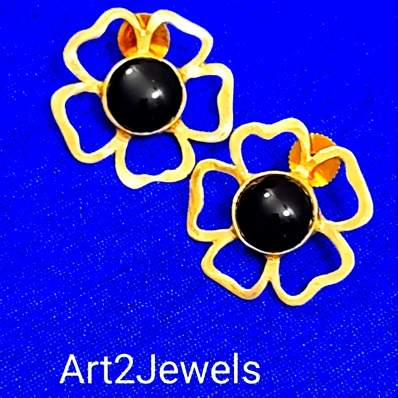 Handmade gold plated black onyx floral motif earring