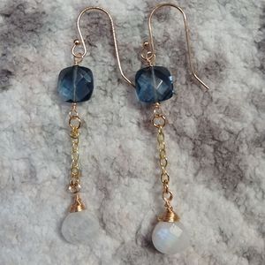 Beautiful handmade earrings plated in 14k gold with Moonstones and faceted blue Topaz!!