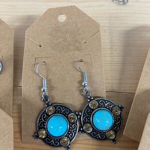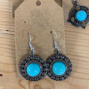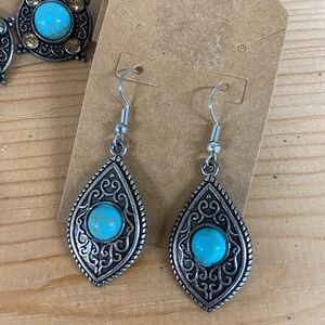 Vintage metal and faux style turquoise stone dangle and stud style earrings. Add some bohemian flair to your jewelry collection with this lot.