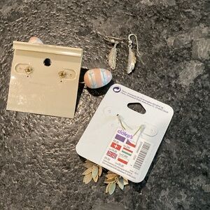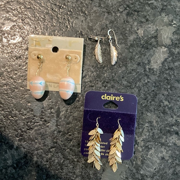 Stylish gold leaf earrings from Claire's. Includes additional feather earring pair and wooden egg (just in time for Easter) earring set. Never worn
