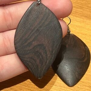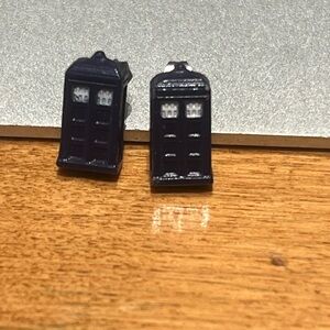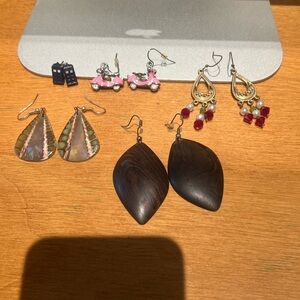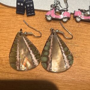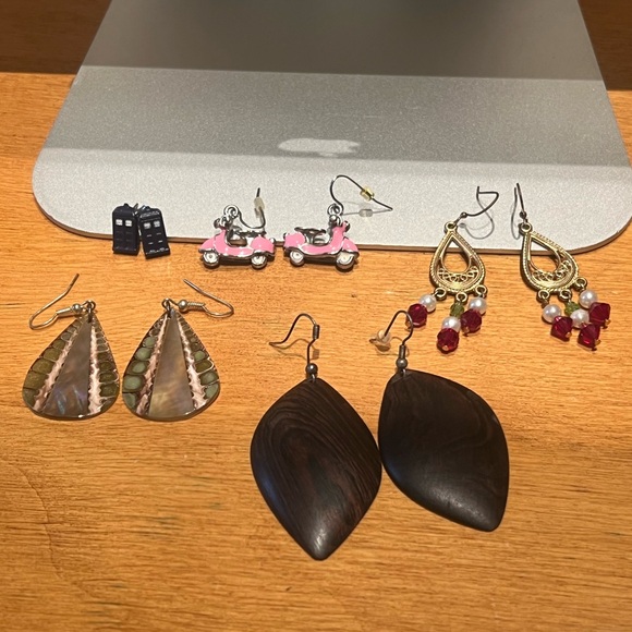Set of 5 earrings: hand-carved wood from Senegal, Doctor Who TARDIS studs, pink scooters, gold teardrops with red beads, and mother of pearl shell drops. Great condition, just not my style anymore.