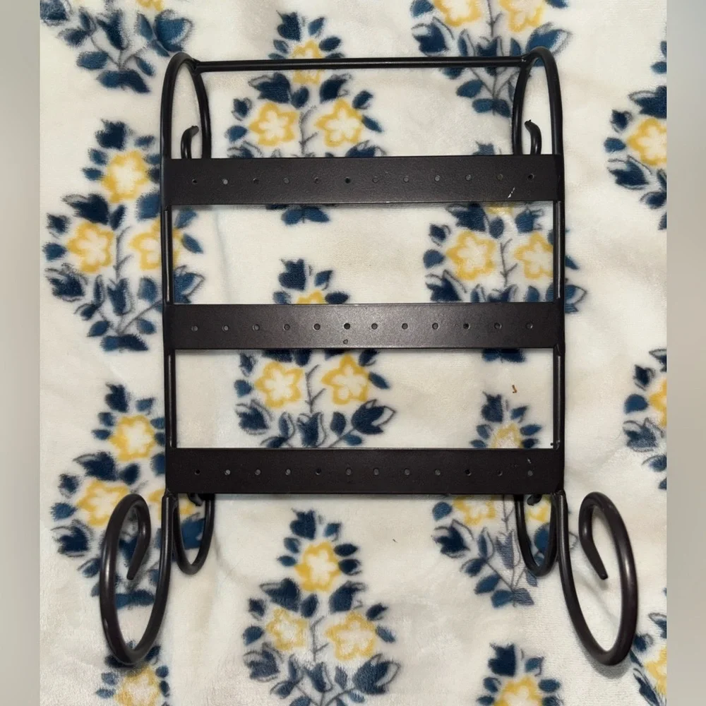 Black metal earring display rack with three slotted bars. Sturdy scroll feet for tabletop display. Simple, versatile organizer for earrings and jewelry.