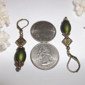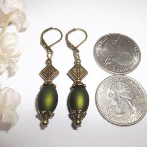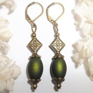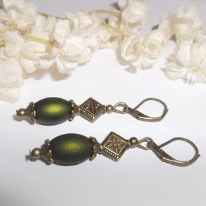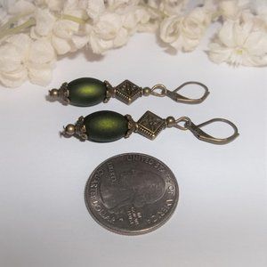 This beautiful bohemian beaded earring set is brand new & handmade by me - wvluckygirl. Done with olive green acrylic beads. They have antiqued boho brown bronze toned costume jewelry beads. The pair dangle & drop from euro wire lever backs for women's pierced ears. Nickel safe. Measures 2 inches tall & 3/8 inch wide. Each single earring weighs 2.7 grams. Very cute! Get them as a sweet treat for yourself or as a thoughtful gift idea for someone else. Buy it now before someone else does!!!