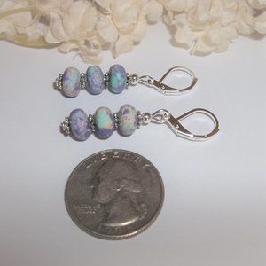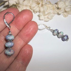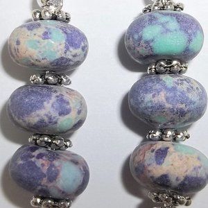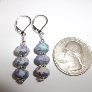 You will love the color combination on this beaded earring set. Brand new NWT and handmade by me - wvluckygirl. Handcrafted with non-symmetrical sea sediment jasper style gemstone stone beads. Beads do have pits/dents in them which is just how they were made and not considered to be a flaw. They are turquoise blue, violet purple, and cream with hints of pink. They almost have a tie dye look to them. They have antiqued silver toned costume jewelry beads. The pair dangle and drop from 925 sterling silver lever backs for her pierced ears. Nickel safe. Measure 1 3/4 inches tall and just over 1/4 inch wide. Each single earring weighs 2.2 grams. Lightweight! Grab them as a sweet treat for yourself or as a thoughtful gift idea for someone else. Buy them now before someone else does!