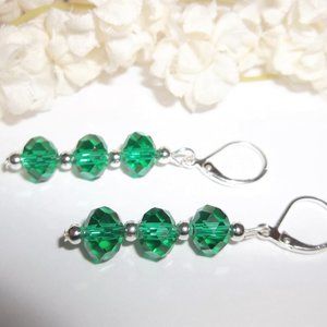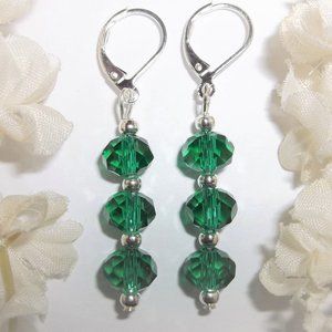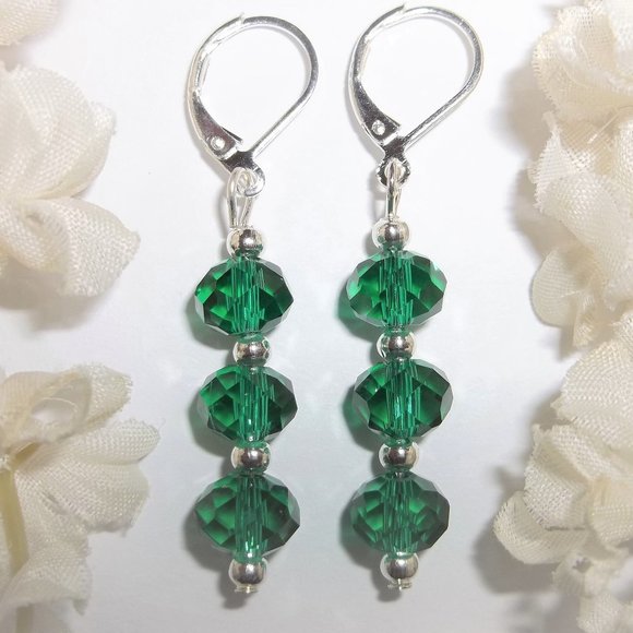 This simple earring set is brand new & handmade by me - wvluckygirl. Done with faceted faux emerald green glass beads. They have silver toned costume jewelry beads. The pair dangle & drop from 925 sterling silver lever backs for women's pierced ears. Nickel safe. Measure 2 inches tall & not quite 3/8 inches wide. Each single earring weighs 2.1 grams. Lightweight! You are sure to get lots of compliments wearing them. Buy them now before someone else does!
