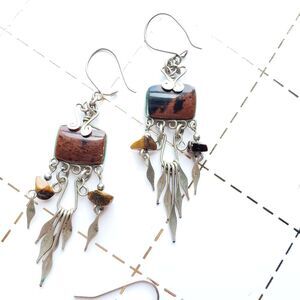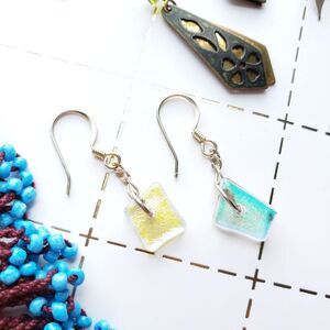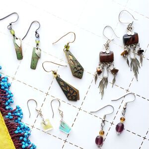 Tackle your workweek with this lot of 5 pairs of earrings. You will receive all five shown- oblong greentone assemblage, cutout assemblage, iridescent dichroic glass drops w sterling hooks (handmade by me), boho tiger eye dangles, and graduated tri-bead drops (also made by me). All have hypoallergenic fishhook posts and have been steam sanitized. An excellent way to jumpstart your collection!
