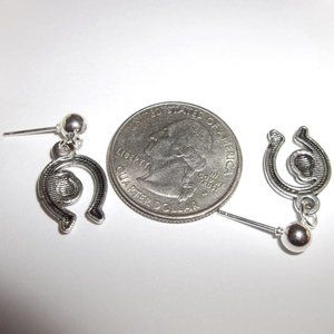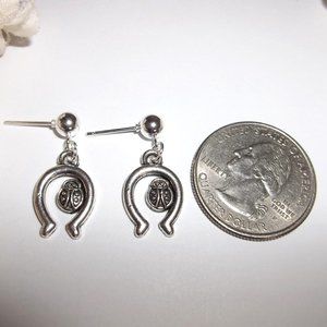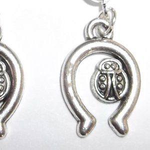 You will love wearing this simple little earring set. Brand new and handmade by me - wvluckygirl. Handcrafted with an antiqued silver toned costume jewelry lady bug and horse shoe charms. The pair dangle and drop from a silver ball. The silver post was made from zinc alloy (lead safe & nickel safe). Measures 7/8 inch tall & 1/2 inch wide. Each single earring weighs 1.5 grams. Very lightweight! Makes a great gift idea for her. Comes with a rubber nut back to hold it on. Buy it now before someone else does!