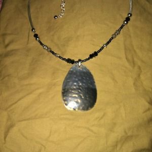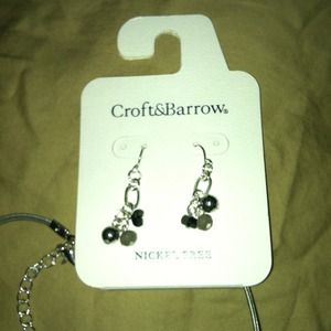 Nickel free earring and necklace set with black beads and black and grey pendent.