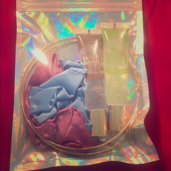Includes: 2 silk scrunchies, 2 clear broadway glosses, 1 pair of gold hoopsđź’–