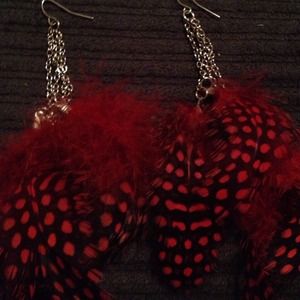 4 pairs for one low price. One pair of leopard print dangles, 1 pair of abalone dangles, 1 pair of red and black feather dangles, and 1 pair of silver teardrops.