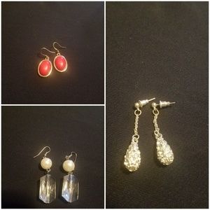 Gold with red stone earrings, silver with clear and pearl stone earrings and silver with rhyne stones earrings