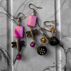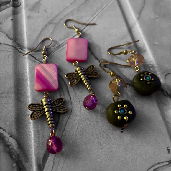 Two pairs of earrings. One pink with dragon flys. And one stone with turquoise.