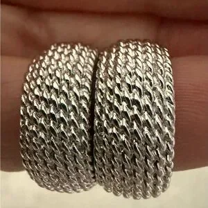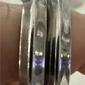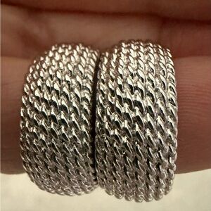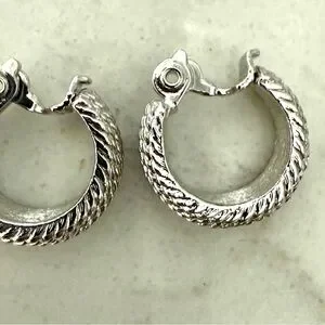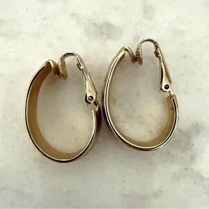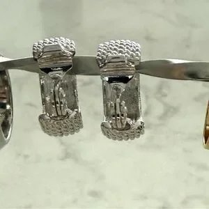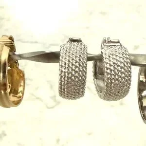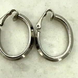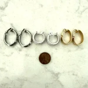 Three pair of hoop earrings. Two silver tone and one gold. No markings. No tarnish but they are older.