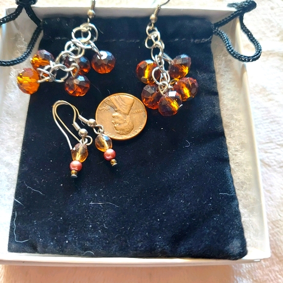 2 pairs of earrings. Dangling, silver loops w/ amber colored beads and dainty amber colored beads on French wires.
