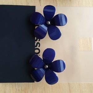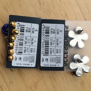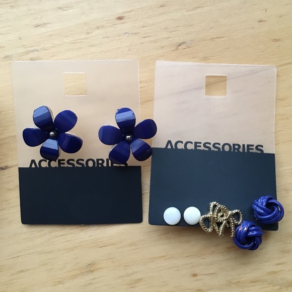 Set of 4 pairs of earrings with blue and white studs, blue flowers, and gold bows. Never worn, brand new!