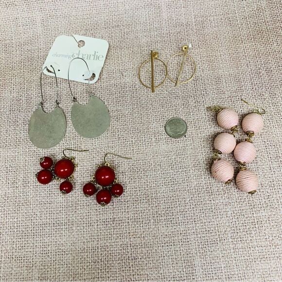 Pink twine wrapped dangles, Charming Charlie silver tone flat hoops, Goldtone circle, burgundy beaded