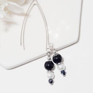 Black white jewelry long dangles on long V hooks dramatic Glass pearls. Discover the perfect pair to elevate your look—shop now and wear your story! #EclecticEarrings #VictorianJewelry #HandmadeEarrings